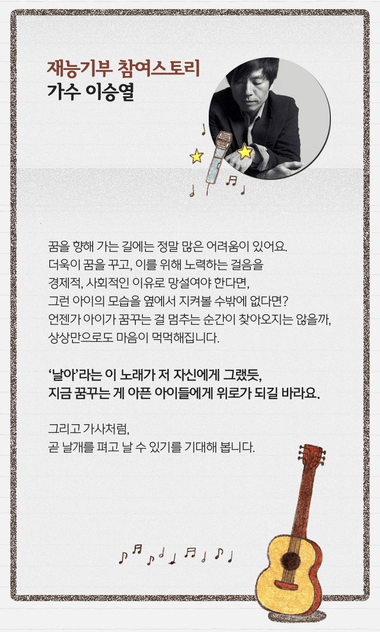 예전에 오빠가 SYBLUE 페이지 운영하실 때 홈화면에 한국컴패션이 링크되어 있었다. 기부할 단체를 찾던 나는 덕분에 컴패션에 기부할 수 있었다. 이번에도 오빠 덕분에 기부할 단체를 찾게 된 것 같아 감사한 마음. 그리고 무엇보다 오빠가 불러주신 날아가 너무ㅠㅠ 너무ㅠㅠㅠㅠ 너무ㅠㅠㅠㅠㅠㅠㅠ 감동적이다ㅠㅠㅠㅠㅠㅠㅠㅠㅠㅠㅠㅠㅠ 날아 원곡도 좋지만 나는 이 버전이 너무 마음에 들고 오빠의 목소리와 기타 소리를 함께 들을 수 있어서 정말이지 처음 노래를 들었을 때 너무너무너무너무ㅠㅠㅠㅠㅠㅠㅠㅠ 가슴이 벅찼다ㅠㅠㅠㅠㅠㅠㅠㅠㅠㅠㅠㅠㅠㅠㅠㅠㅠㅠㅠㅠ 이승열의 존재와 이승열의 목소리와 이승열의 기타연주는 세상에서 가장 귀한 것이기 때문. 오늘까지 계속 반복해서 듣고 듣고 또 듣고 있는데 듣고 듣고 또 들을 때마다 오라버니에게 새삼 또다시 반하고 반하고 또 반할 수밖에 없다. 감사합니다 초록우산 어린이재단ㅠㅠㅠㅠㅠㅠㅠㅠㅠㅠㅠㅠㅠㅠㅠㅠㅠㅠㅠㅠㅠㅠㅠㅠㅠㅠㅠㅠㅠㅠㅠㅠㅠㅠㅠㅠㅠㅠㅠㅠㅠㅠㅠ