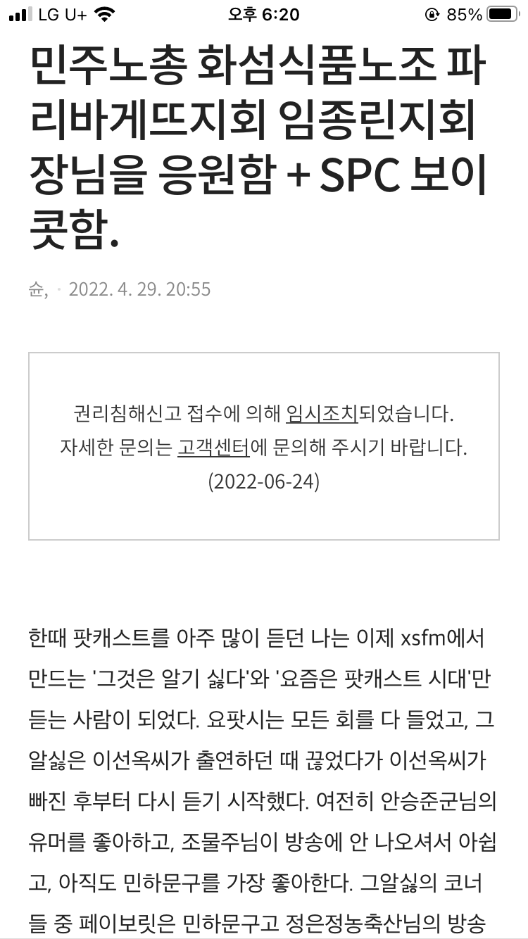 이 포스팅도 신고해서 임시조치되게 만들면 SPC 불매 더 열심히 하고 SPC 규탄하는 포스팅 또 올릴 거임. SPC는 사회적 합의 이행하고 노동자들의 권리를 보장하라!