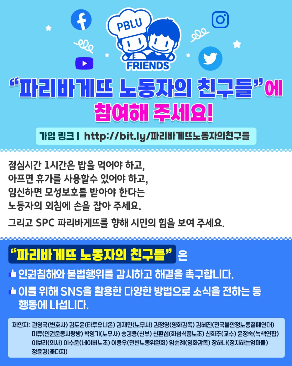 '파리바게뜨 노동자의 친구들'에 참여하겠다고 이름을 올린 주제에 한 일이 없는 나는, SPC가 나를 신고한 것에 대한 짜증과 불쾌함과 불안함에서 빠져나와, 계속 파리바게뜨 노동자분들의 승리를 기원하며 내가 할 수 있는 작은 일들을 계속해 나가겠다고 다짐했다. 포스팅을 하고, 보이콧을 하고, 주변의 수많은 소비자들에게 사실을 알리는 것이다. 누군가는 이렇게 곡기를 끊으며 싸우시는데, 먹을 거 다 먹고 사는 내가 이정도는 해야 하지 않을까. 그래서 또다시 '파리바게뜨 노동자의 친구들'에 참여할 수 있는 페이지를 링크해 본다. 지난번 링크는 SPC가 신고해서! 임시조치되어서!! 티스토리가 접근을 막아놓은!!! 그 글에!!!! 있으니까!!!!! 새로 다시 올리는 것이다!!!!!!