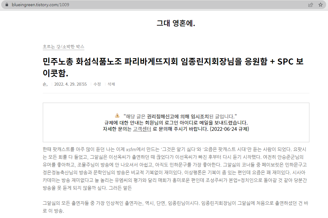 한동안 블로그에 포스팅을 못했다. 직장일이 너무 바쁘기도 했고 블로그에 접속하면 준석님 생각이 나가지고 준석님 포스팅했던 것들을 백번천번씩 다시 보다가 포스팅할 의욕을 잃은 채 자러 가는 날도 많았다. 그리고 무엇보다 짜증나는 일: 파리바게뜨지회 임종린지회장님의 단식투쟁에 대해 썼던 글이 권리침해신고당해서 임시조치된 일이 있었다. 아나 진짜 너무 짜증나가지고ㅋㅋㅋㅋㅋㅋㅋㅋㅋㅋㅋㅋㅋㅋㅋㅋㅋㅋㅋㅋㅋㅋㅋㅋㅋㅋㅋㅋㅋㅋㅋㅋㅋㅋㅋㅋㅋㅋ 노동자의 권리를 보장하기는 커녕 산산조각내는 데 앞장서는 분들이 본인들 권리는 엄청 지킴ㅋㅋㅋㅋㅋㅋㅋㅋㅋㅋㅋㅋㅋㅋㅋㅋㅋㅋㅋㅋ 캬 진짜 누가 누구를 권리침해신고하는 건지 어이가 없을 지경인데 이와 함께 '신고가 들어왔으니 우리는 중립적으로 블라인드 처리함 땅땅땅'하는 티스토리 측의 대처도 나를 빡치게 했다. 연초에 산타클라리타다이어트 내용 포스팅했다가 혐오스러운 글이라며 신고당했을 때도 어이가 없었지만 그래 그럴 수도 있지, 언데드를 다루는 내용이니까 누군가에게는 혐오스러울 수 있지...하며 이해했는데, 이번의 권리침해신고는 표현의 자유에 대한 탄압이라는 말 말고 다른 그 어떤 말로 설명할 수 있는 건지 모르겠어서 아주 화가 났다.