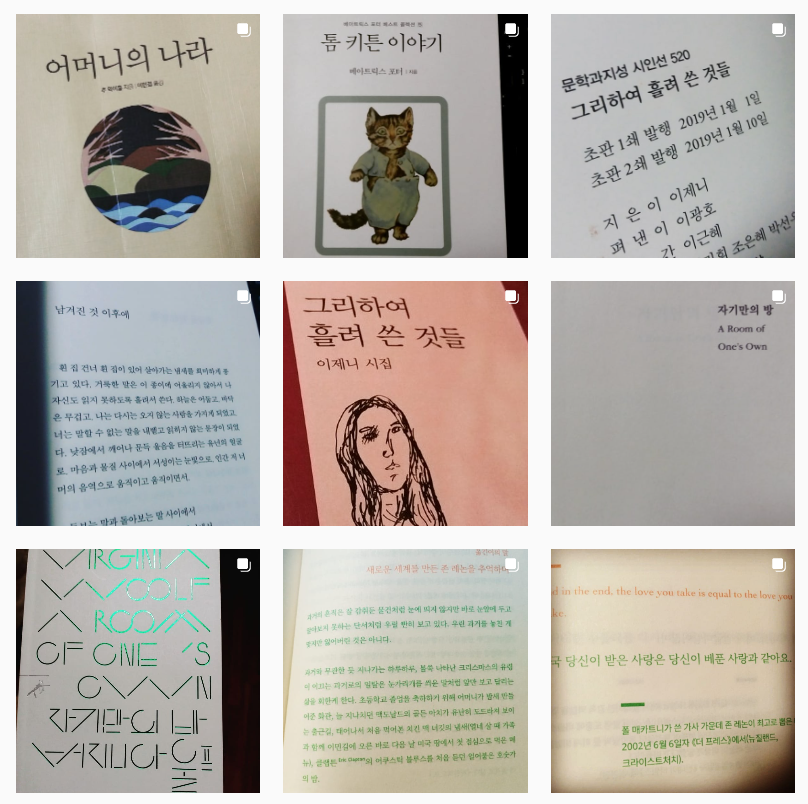 6) 결국 인스타에 올리는 책도 좋았던 책 중심이 되는 경우가 많아서(즉 안 올리는 책들도 종종 생겨서) 피드를 쭉 보며 그래 이 책 참 좋았었어...라고 만족스런 기분을 느낄 수 있다.