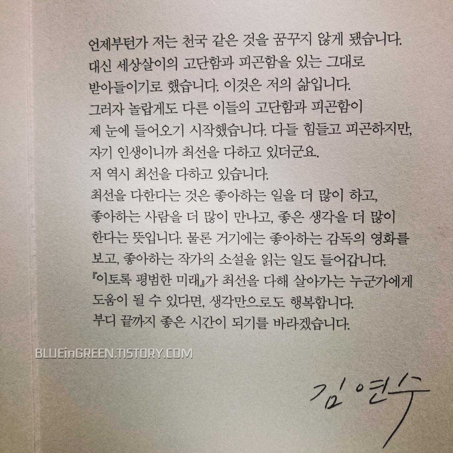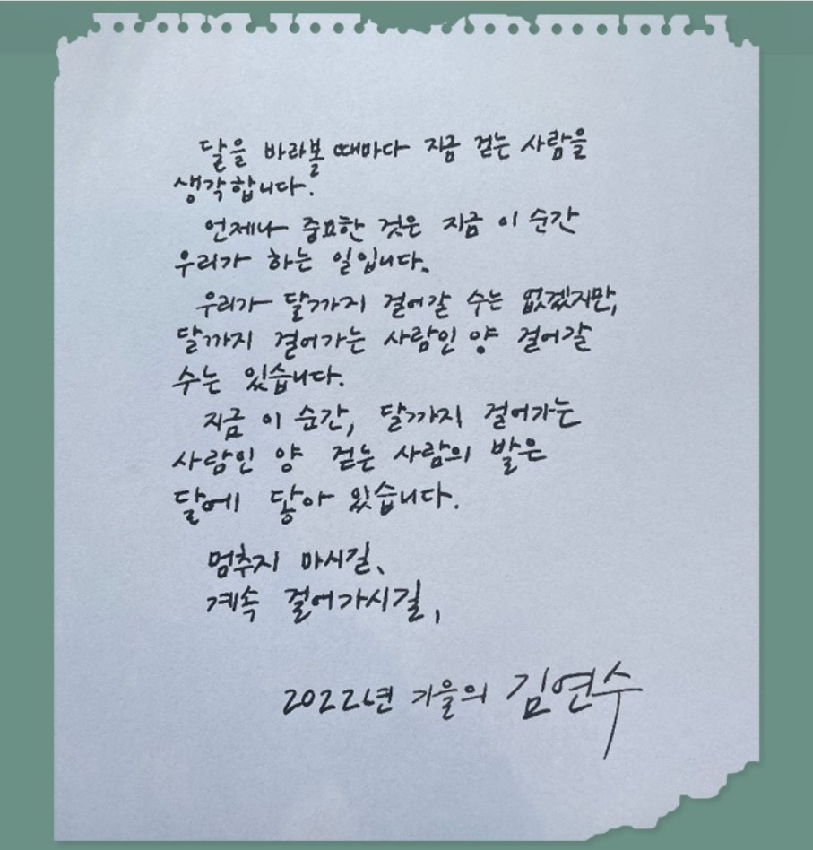 그러니 '믿음도 기대도 없는' 나는, '믿음도 기대도 있는 사람'인 양 행동하려고 더 노력해야 하는 게 아닐까. 달까지 걸어갈 수는 없겠지만 달까지 걸어가는 사람인 양 걸어갈 수는 있는 게 사람이니까, 타인에 대한 믿음도 기대도 없는 나 역시 타인에 대한 믿음과 기대가 많은 사람인 것처럼 타인을 대하려고 애써야 하지 않을까. 그러면서 내가 좋아하는 일을 더 많이 하고, 좋아하는 사람을 더 많이 하고, 좋아하는 소설을 더 많이 보다 보면, 좋은 생각도 더 많이 할 수 있지 않을까. 소설가님이 독자들에게 올 가을 남겨주셨던 편지의 내용처럼.