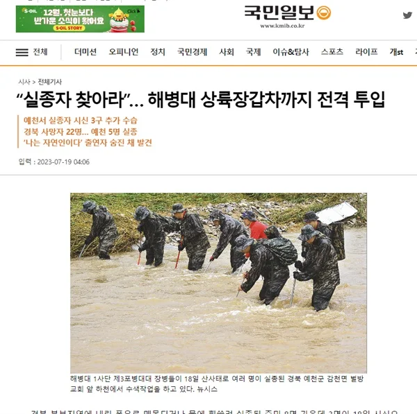 2. 그런데 뉴시스에서 찍은 사진을 보면 18일에 장병들이 안전 장구 없이 하천 본류에 들어가 수색 작업을 하고 있음.
