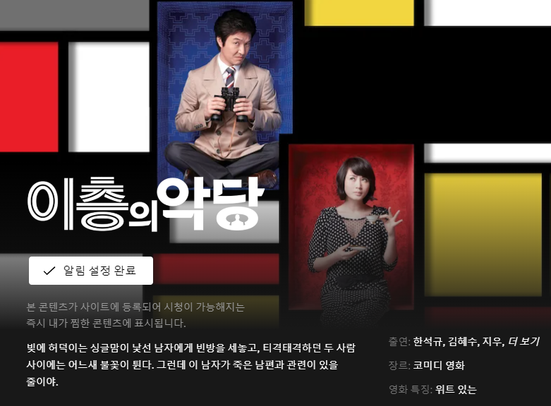 그리고 백년의 고독만큼 기다리고 있는 것은 이층의 악당ㅋㅋㅋㅋㅋㅋㅋㅋㅋㅋㅋ 세상에나 이층의 악당이 넷플에 들어온답니다 세상사람드으으으으을!!!!!!!!!!! 한석규아저씨 영화 중에 제일 웃긴 영화라고 생각하는 영화인데 넷플 들어온다니 너무 신나네(생각해 보면 한석규아저씨가 웃긴 영화에 많이 나오시진 않음...). 어차피 10월 되면 이토록 친밀한 배신자 보면서 한석규아저씨 엉엉엉 하고 있을테니까 그 전에 이층의악당 보면서 아저씨 기다려야지 흑흑흑흑흑.