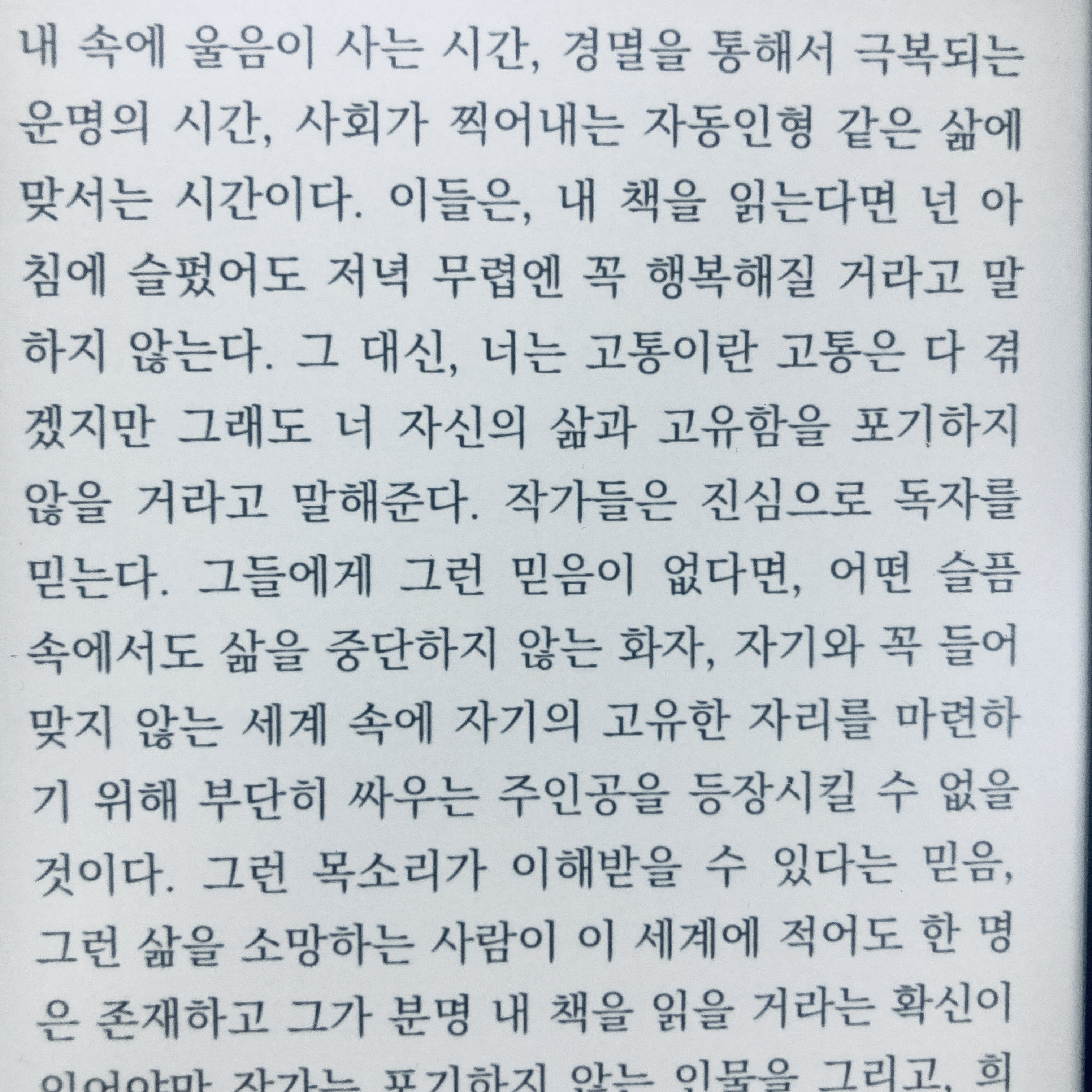 좋은 작가는 아첨하지 않는다. 오랜 친구처럼 우리에게 진실의 차가운 냉기를 깊이 들이마시라고 무심한 얼굴로 짧게 말한다. (중략) 그들에게 삶은 계속되는 소송이거나 400년 내내 분투한 뒤에야 겨우 이룰 수 있는 소망, 다시 굴러떨어지는 바윗돌, 보상 없이 행하는 사랑, 끝없이 헤매다 제자리로 돌아오게 하는 겨울 숲 같은 것이다. 또는 내 속에 울음이 사는 시간, 경멸을 통해서 극복되는 운명의 시간, 사회가 찍어내는 자동인형 같은 삶에 맞서는 시간이다. 이들은, 내 책을 읽는다면 넌 아침에 슬펐어도 저녁 무렵엔 꼭 행복해질 거라고 말하지 않는다. 그 대신, 너는 고통이란 고통은 다 겪겠지만 그래도 너 자신의 삶과 고유함을 포기하지 않을 거라고 말해준다. 작가들은 진심으로 독자를 믿는다. 그들에게 그런 믿음이 없다면, 어떤 슬픔 속에서도 삶을 중단하지 않는 화자, 자기와 꼭 들어맞지 않는 세계 속에 자기의 고유한 자리를 마련하기 위해 부단히 싸우는 주인공을 등장시킬 수 없을 것이다.