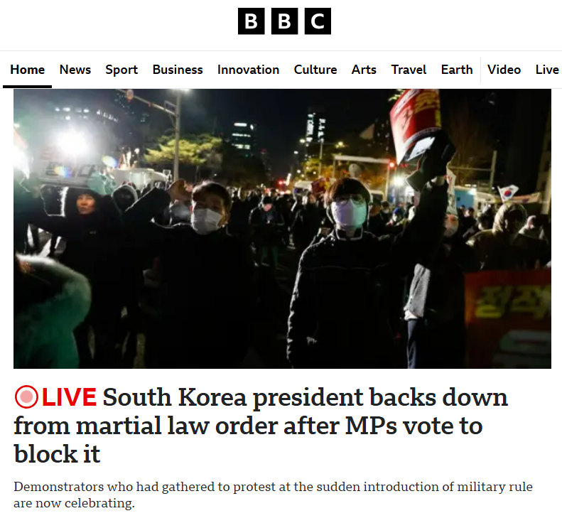 윤석열은 지금으로부터 2시간 50분 전인 12월 3일 밤 10시 25분경 계엄을 발표했고, 35분 후인 밤11시 계엄사령부가 포고령을 발표했습니다. 내용은 의회와 정당의 활동, 결사/집회/시위 등의 모든 정치활동 금지, 언론/출판 통제, 파업/태업/집회행위 금지, 의료인 본업 복귀 등입니다.