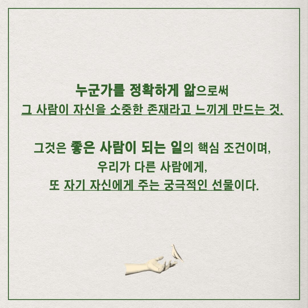 물론 여전히 나는 '타인을 정확히 안다는 것은 불가능한 일'이라고 생각한다. 하지만 '타인을 정확히 알려고 노력하는 일'을 계속해나가는 것은 타인보다도 나 자신에게 도움이 되는 일이라는 걸 살아가는 내내 계속 더 배우고 있다. 나 자신이 지금의 나보다 더 나은 인간이 되기 위해서는, 내가 소중한 존재라는 생각으로부터 벗어나 타인이 소중한 존재임을 진정으로 인정하고 그의 존재를 존중해야 한다. 타인을 깊이 알고 이해하기 위해 노력하는 것은 나 자신에 대해 더욱더 잘 알게 해 주는 것임을 확신한다. 머릿속으로만 어떠한 사람이 되어야지 생각하지 말고, 그러한 사람이라면 마땅히 할 법한 행동을 적극적으로 하라는 메시지를 확실히 전달받을 수 있었다는 점에서 작년의 나에게 좋은 책이었다.
