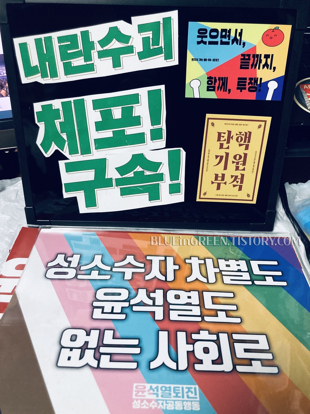 가장 무난한 문구라고 생각하는 '내란수괴 체포! 구속!'이 쓰여있던 피켓을 3주째 들고 다녔더니 너무 구깃구깃해져서ㅋㅋㅋㅋㅋ 재활용하였다. 한남동에서 받은 나눔문화의 미니피켓과 지난주에 페미퀴어네트워크에서 주신 스티커를 같이 붙였더니 아주 마음에 든다. 페미퀴어네트워크에서 주신 피켓과 무지개행동에서 주신 피켓이 둘다 좋아서 지난주 집회 때 양면으로 붙여 썼는데(이럴 때 쓰일 수 있어 스카치테이프 가지고 다님ㅋㅋㅋㅋㅋㅋㅋ) 이왕 마음에 든 거 오래 쓰려고 파일에 넣었다. 다 들고 가서 흔들어야지. 아주 든든하구만.