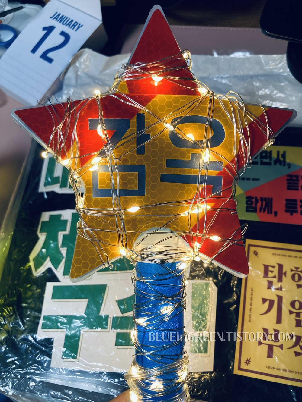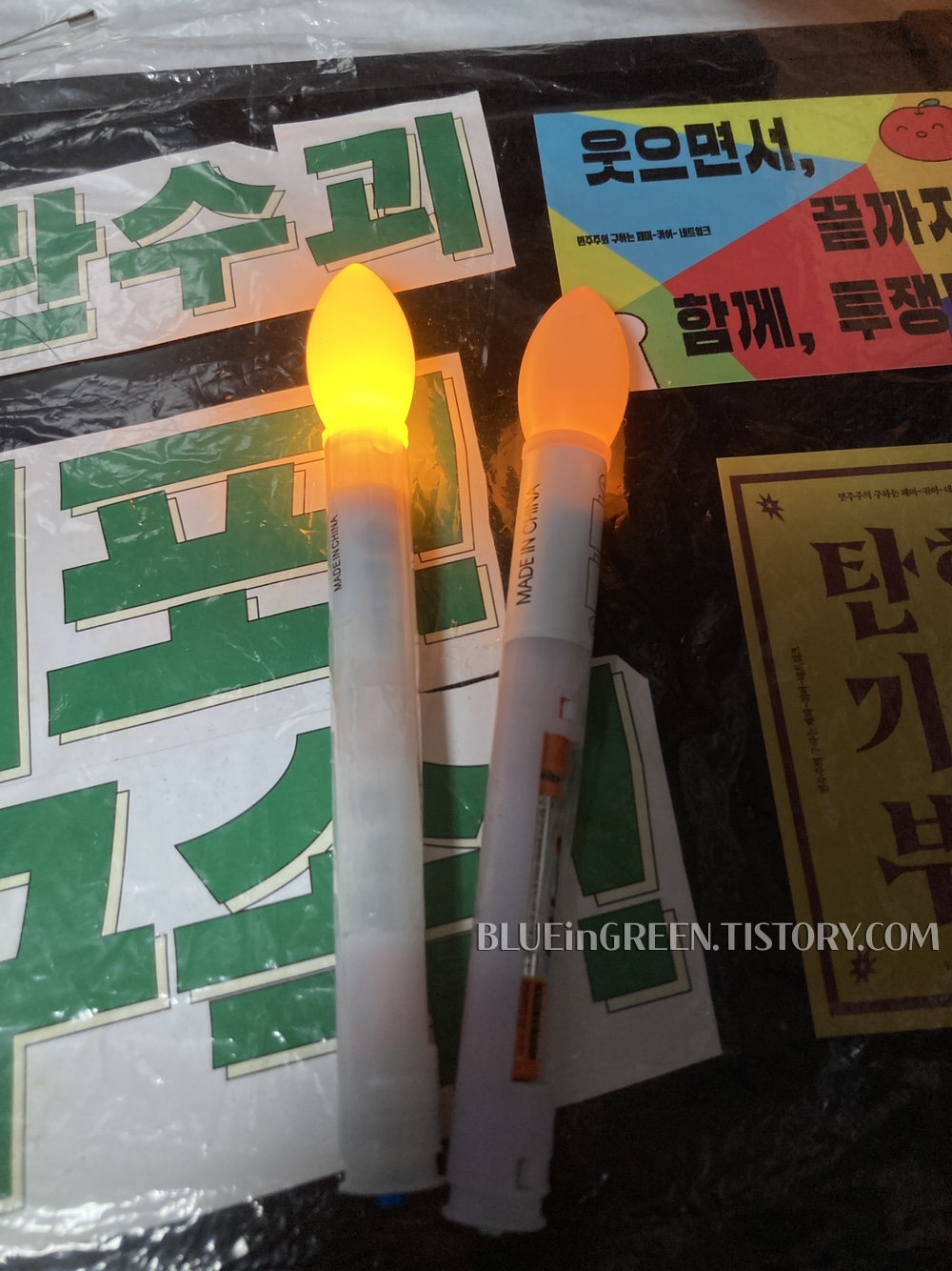 장갑도 없으면 안 된다. 피켓과 빛나는 물체를 들기 위해서는 장갑이 꼭 있어야 한다. 안그러면 추운 데서만 그치는 게 아니라...손이 다 트고 터져서ㅠㅠ 피투성이가 됨ㅠㅠㅠㅠㅠ 안그래도 손이 거친 인간이라 장갑 꼭 껴줘야 함. 근데 장갑을 잃어버려서 흑흑흑 아직도 슬프네ㅠㅠㅠㅠ 올해 새로 개시한 장갑이라 완전 새건데ㅠㅠㅠㅠㅠㅠ