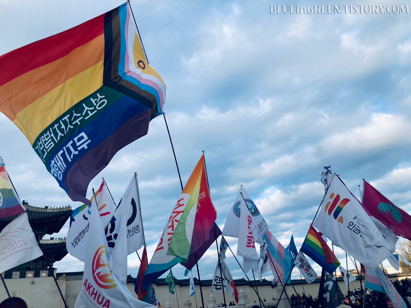 오늘은 아침에 일정이 좀 있었어서ㅠ 평소보다 좀 늦게 도착했다. 도착했더니 양반들이 공연을 하고 있었음. 어디로 자리를 잡아야 되나 싶어 방황하다가(앞쪽에 빈자리 없나 하고 헤맴) 에라이 됐다 하고 그냥 뒷자리로 가야겠다 하며 이동하는 길에 여러 부스들을 지나쳤다. 416연대 부스에서 주시는 피켓과 페미퀴어네트워크 부스에서 주시는 피켓을 둘다 받고 싶어서 두 부스를 찾아갔다. 늦게 도착해서 받을 수 있으려나 했는데 다행히 다 받을 수 있었다. 감사합니다 흑흑.