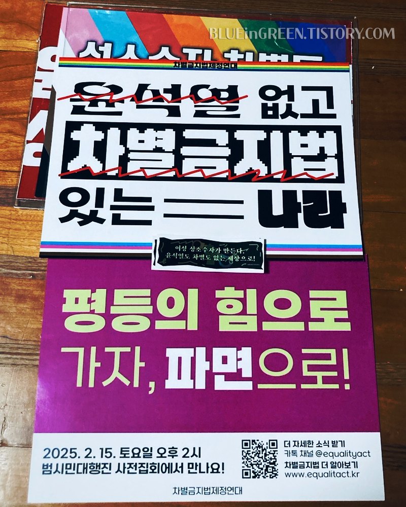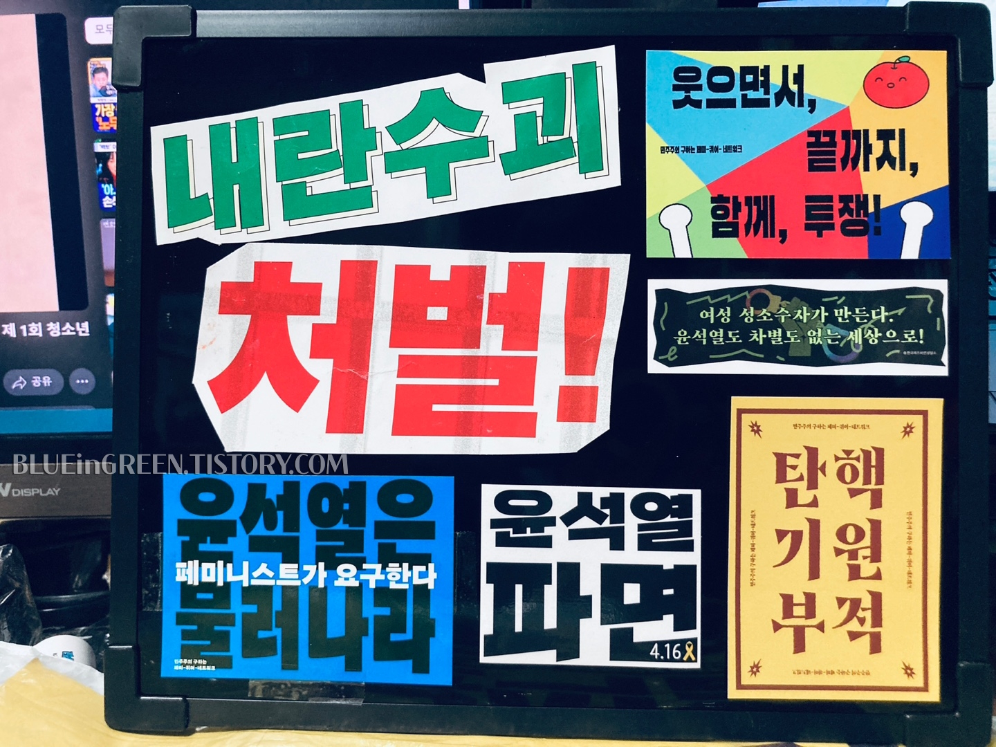 집회 갈 때마다 새로 피켓을 받지 않고 최대한 쓰던 걸 계속 쓰려고 하기는 하는데...이번주엔 어쩔 수 없었다ㅠㅠ 다음주엔 재활용해야지. 사실 성소수자 차별도 윤석열도 없는 사회로라는 문구가 쓰인 피켓을 특별히 좋아해서 이걸 가장 자주 들고 있긴 한다. 그냥 무지개 말고 프로그레시브 무지개를 배경으로 하고 있는 것도 좋다ㅠㅠ 구겨지지 말라고 파일에 넣어 두었음. 피켓이랑 같이 들기 위해 늘 가지고 다니는 블랙보드도 업데이트(!!!)하였다. 원래는 내란수괴 처벌! 구속!이라는 문구가 크게 붙어 있었는데(작년에 쓰던 피켓 재활용ㅋㅋㅋㅋㅋㅋㅋㅋ) 구속은 되었으니까 이제는 파면으로.
