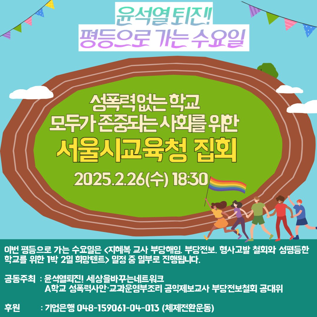 2월 마지막 집회...라고 썼다가 생각해보니 집회는 주말이 아닐 때도 여기저기서 계속 열리고 있어 지웠다. 다음주에는 주중 집회를 가볼 생각이다. 안그래도 다음주 수요일에 서울시교육청 앞에서 '평등으로 가는 수요일' 집회가 열린다고 함. 지혜복선생님 꼭 복직되시길ㅠㅠ