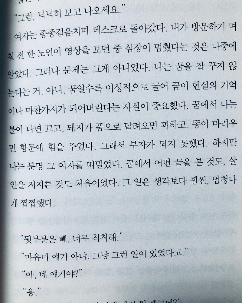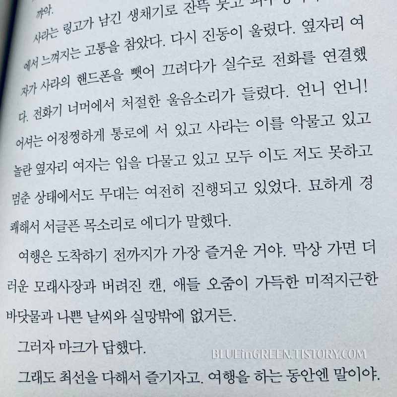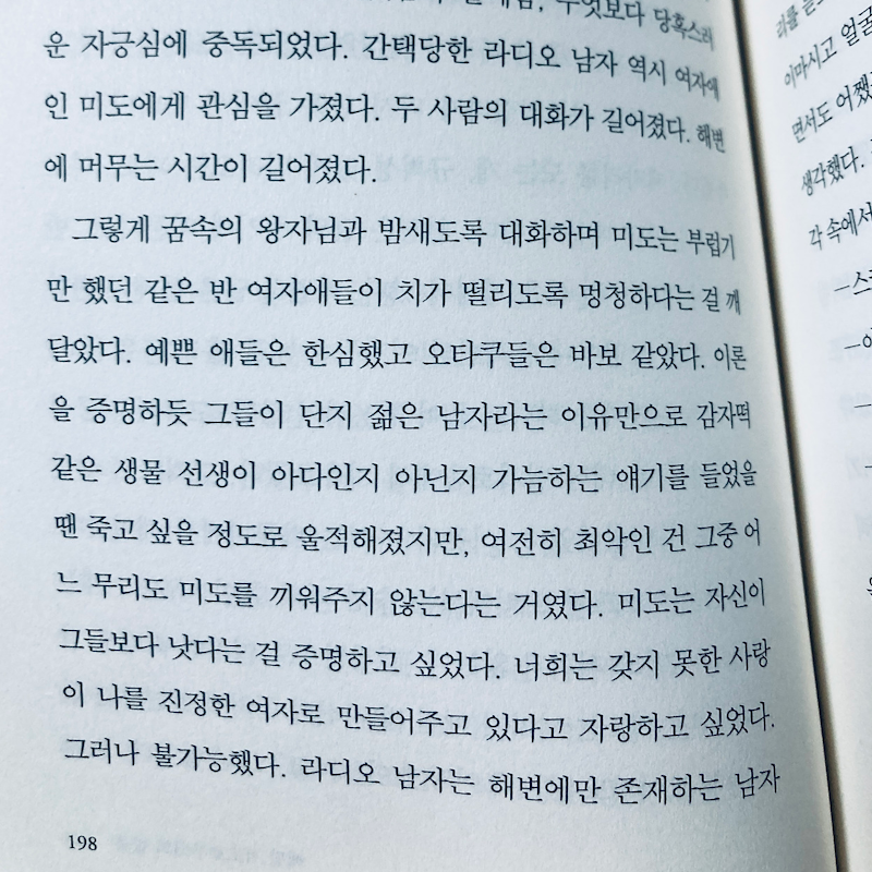 하지만 해변 지도로부터의 탈출의 미도는 나에게 큰 호감의 대상이었으며ㅠㅠ 이 작품에서 가장 슬픈 소설이 나는 이 작품이었다. (그다음으로 슬펐던 건 사랑, 기억하고 있습니까였음) 아 정말 소설을 읽다가 몇번이나 앞장을 다시 넘기며 미도의 (생물학적) 성별을 확인하고 슬퍼하고 또 슬퍼했는지ㅠㅠㅠㅠ 시스젠더인가 아닌가에만 집중한다면 미도의 감정을 내가 온전히 이해하긴 불가능하다고밖에 말할 수 없을 거다. 그러나 미도가 한 어떠한 행동들은 어린 시절 내가 했던 어떠한 행동들과 완벽히 일치하기도 하여, 나는 소설을 읽다가 문득 수치심이나 자책감 비슷한 감정을 느꼈고, 그러다 문득 그때 왜 그렇게 어리석은 행동을 했었는지 생각하게 됐고, 미도가 안타까워졌고, 그 시절의 나도 안쓰러워졌다.