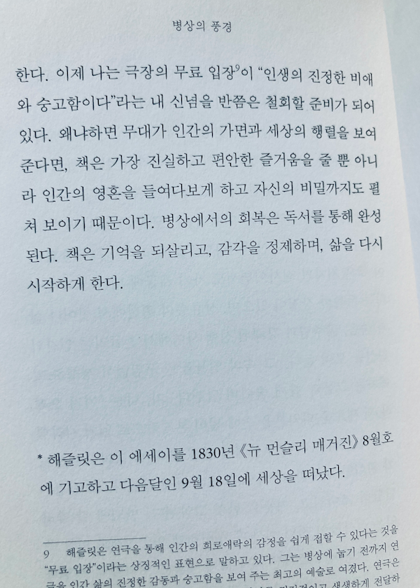 그런데 후반부에 실린 세 글은 약간 달랐다. 물론 여전히 생생하고 날카로웠으며 엄청 웃으며 읽었지만, 웃음 뒤에 짙은 페이소스가 느껴졌다. 하필 세 글이 돈 없이 살아간다는 것은, 영원히 살 것 같은 느낌에 대하여, 병상의 풍경이다보니 그럴 수밖에 없었다. 그래서 다른 글과 달리, '윌리엄 해즐릿'이라는 사람이 보이는 느낌이었다. 가난의 고통 속에서도 어떻게든 날카로움과 우아함을 잊지 않으려고 애쓰는 사람, 하지만 그게 너무 힘든 사람. 짧은 청춘을 돌아보면서 자신의 생이 점점 소멸을 향해가고 있음을 실감하지만 세계에 자신의 흔적을 무엇이라도 남기고 싶어하는 마음을 차마 감추지 못하는 사람. 그리고 육체적 고통으로 시든 자신에게 생기를 불어넣기 위해, 아픔이 아직 가시지 않은 와중에도 책을 놓지 못하는 사람...