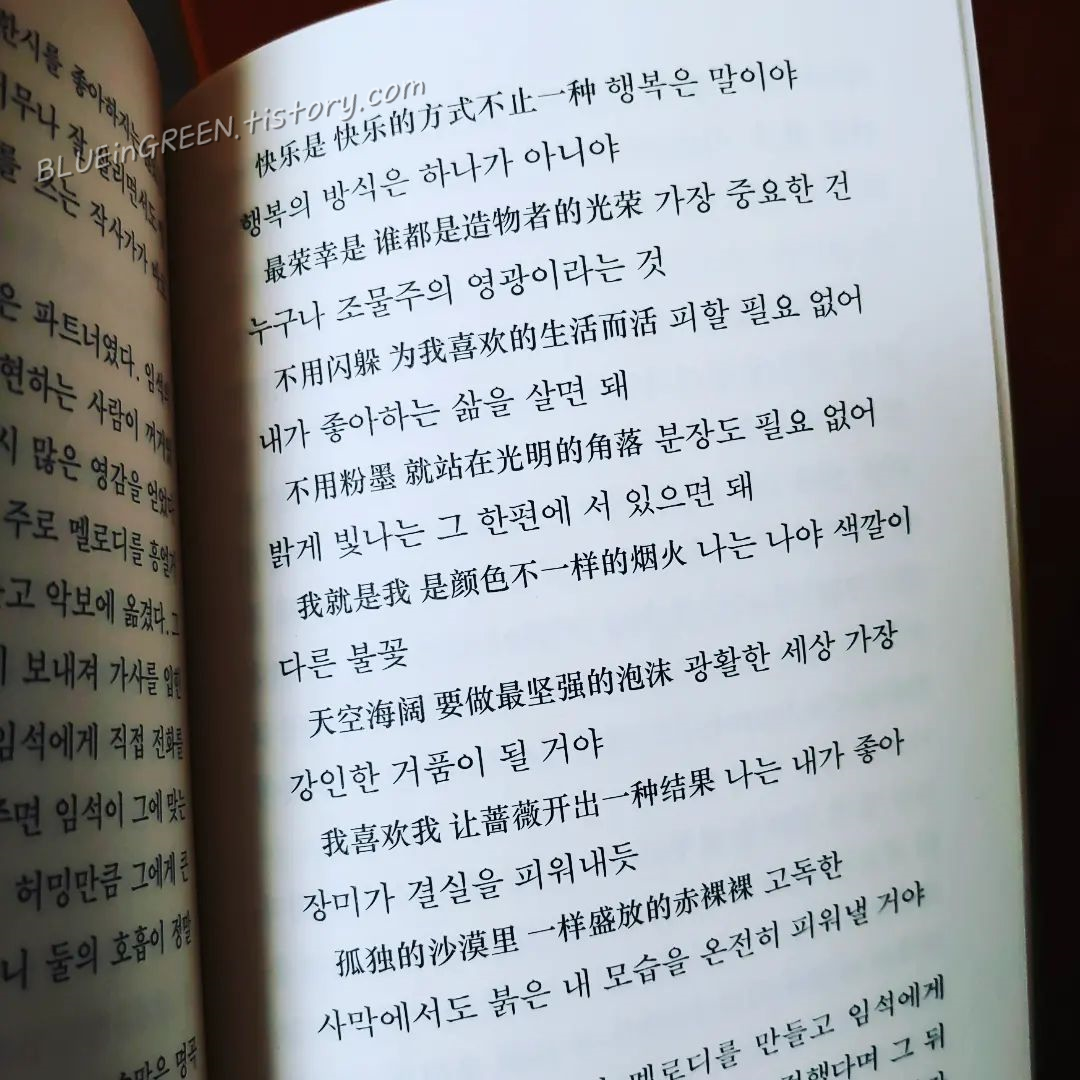 그리고, 이 노래를 꼭 들어봐야겠다고 생각했다. 저자가 장국영 작곡, 임석 작사 중 최고의 곡으로 꼽았던 '아(我)'. 광활한 세상 가장 강인한 거품이 될 거야라는 표현이 너무너무너무 좋았다. 나도 그런 거품이 되고 싶다 :)