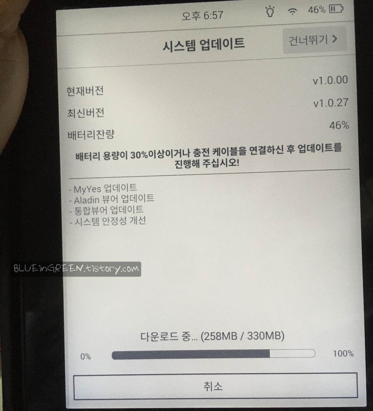 잠시후 완료. 최신 시스템을 사용 중이라고 하니까 엄청난 최신의 기술을 사용하고 있는 것 같지만 이북 단말기를 기계로서 평가하자면 정말 뭐랄까 스마트폰 처음 대중화되던 시기의 슬라이드폰같은 느낌?ㅋㅋㅋㅋㅋ 여튼 와이파이를 (다시) 연결한 다음,