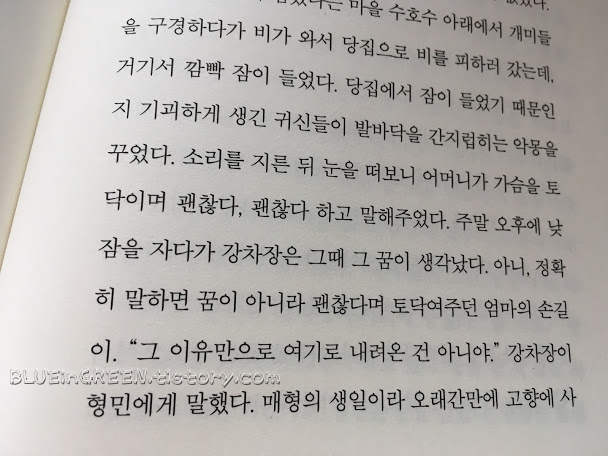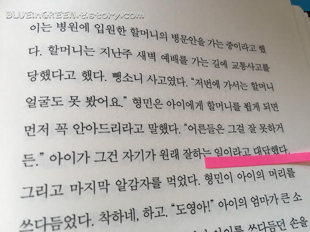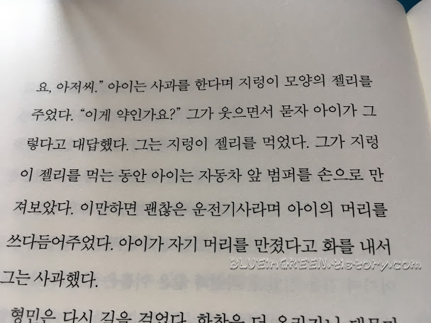 형민은 버스를 타고 아내는 택시를 탔다. 그리고 그 택시는 사거리에서 신호위반을 하다 트럭을 박았다. 형민의 아내는 응급실에서 일주일을 버텼다. 아내의 귀에 대고 형민은 늘 똑같은 말을 했다. "어서 일어나자. 그러면 내일 풍경이 다르게 보일 거야." (177쪽)
