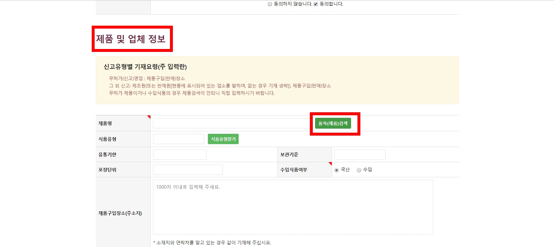 '동의합니다'까지 체크한 후 제품 및 업체 정보를 쓰는데 제품명을 쓸 때는 저 '품목(제품)검색'을 클릭해야 한다.