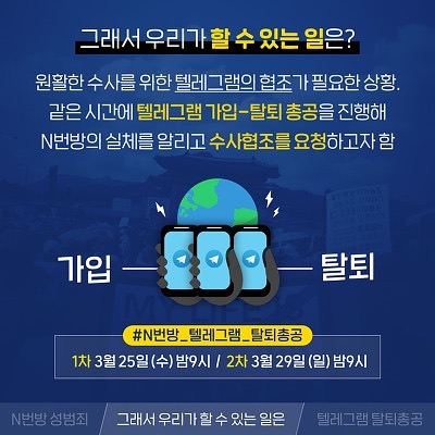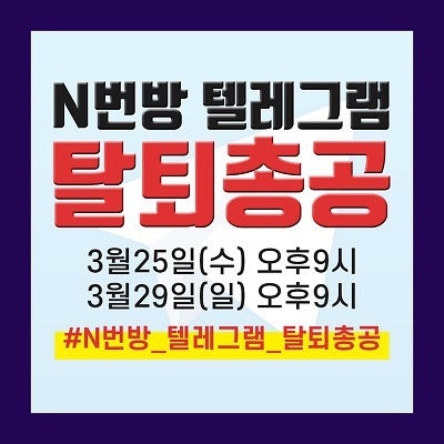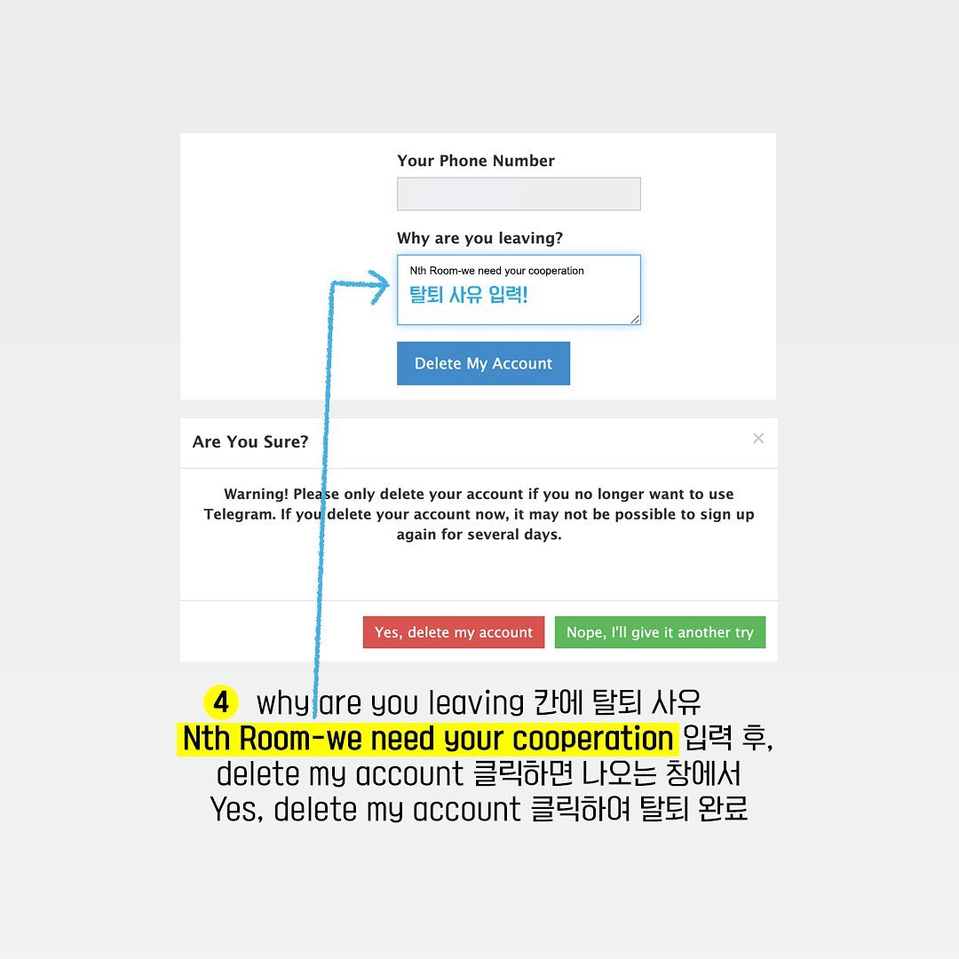 텔레그램에서는 아직 뻔한(뻘한) 답변을 하고 있어서 29일에 2차 탈퇴총공을 펼친다고 함. We need your cooperation, Telelgram. Nth ROOM OUT.