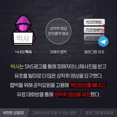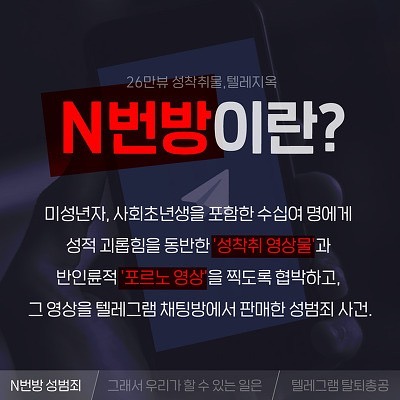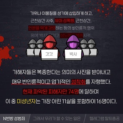 박사가 잡혔지만 갓갓도 잡히기를 바라며 N번방 텔레그램 탈퇴총공팀의 인스타 계정에서 올려주신 'N번방이란?' 게시물도 공유함. 갓갓이든 박사든 와치맨이든 방 열고 돈받은 자들 협조한 자들 방조한 자들 유포한 자들 구매한 자들 모두다 처벌받아라 부디.