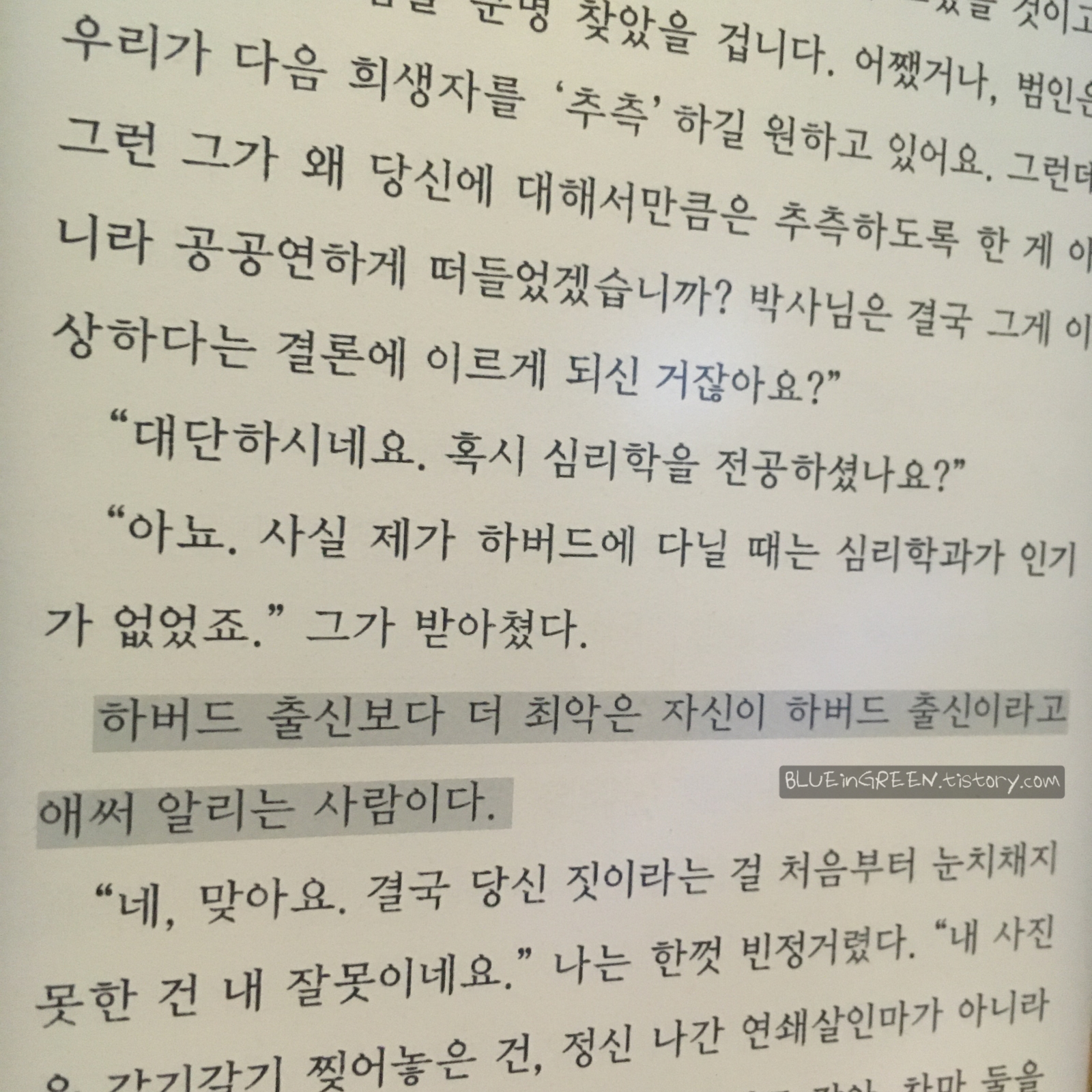 그리고 또 뭘 읽었지…(지금 카르타G 열고 찾아봄) 우선 클레어 맥킨토시의 '나를 지워줄게'를 읽었는데 지나치게 반전을 만들려고 애를 쓴 느낌의 책 같았음. '우리는 차별하기 위해 태어났다'는 나름대로 의미 있게 기억할 만한 내용들이 있는 책이었고, '사이코패스는 일상의 그늘에 숨어 지낸다'는 계속 한숨을 쉬며 읽음. '죽어가는 것에 대한 분노'는 의도치 않았으나 앞의 책과 엮어 읽은 느낌이 되어버렸고(여성을 강간하고 죽이는 연쇄살인자를 소재로 한 소설이었음) 제일 최근에 완독한 '살인 카드 게임'은 정말 재미없을 것 같은 느낌이었지만 생각보다 나쁘지 않았다. 카르타G를 구입한 후 읽은 네 편의 스릴러 소설 중 이 책이 제일 나았던 것 같다. (별 의미 없지만) 순위를 굳이 매기자면 살인 카드 게임>죽어가는 것에 대한 분노>>나를 지워줄게>>>>>>>>>(다른 차원의 강)>>>>>>>>>>>>312호에서는 302호 여자가 보인다.