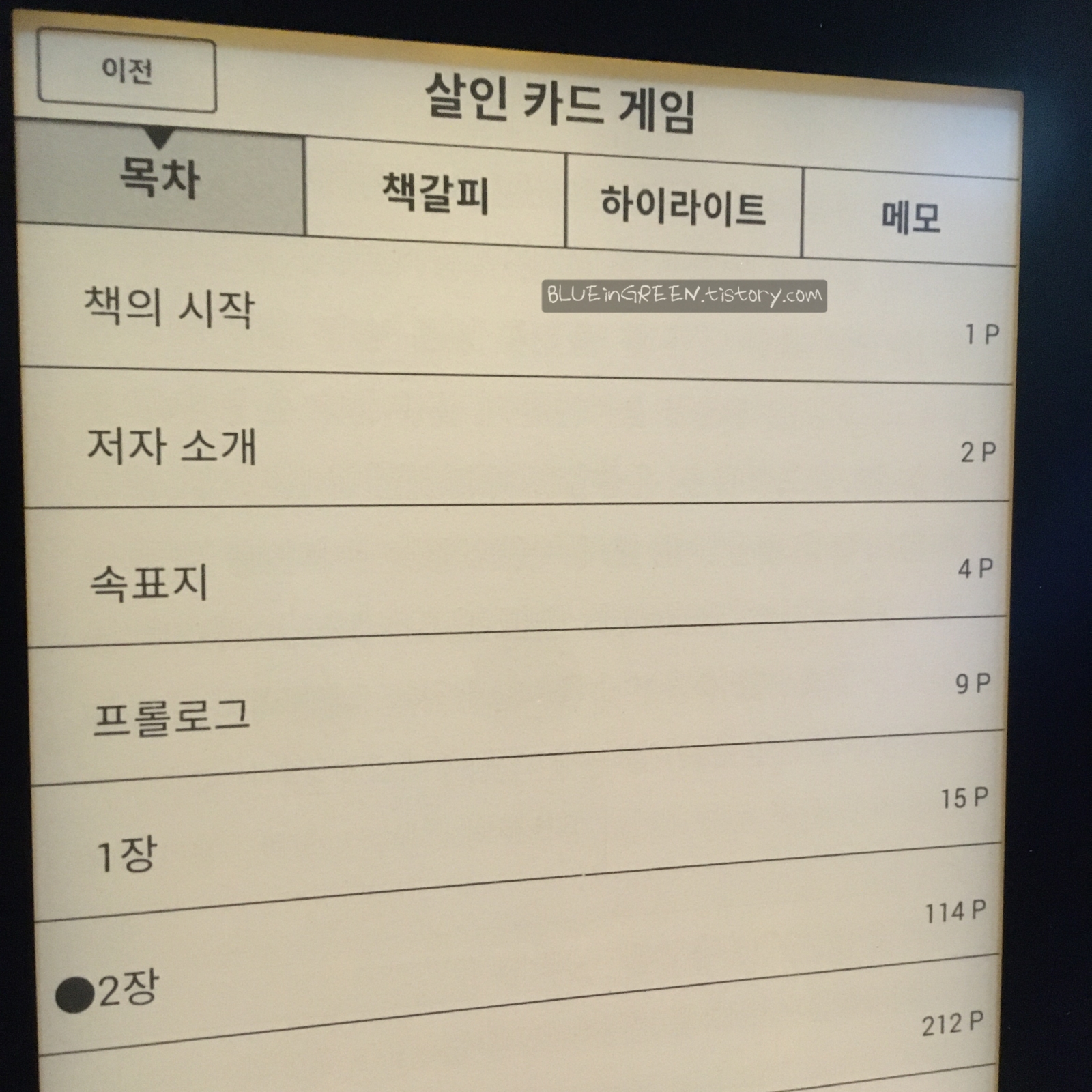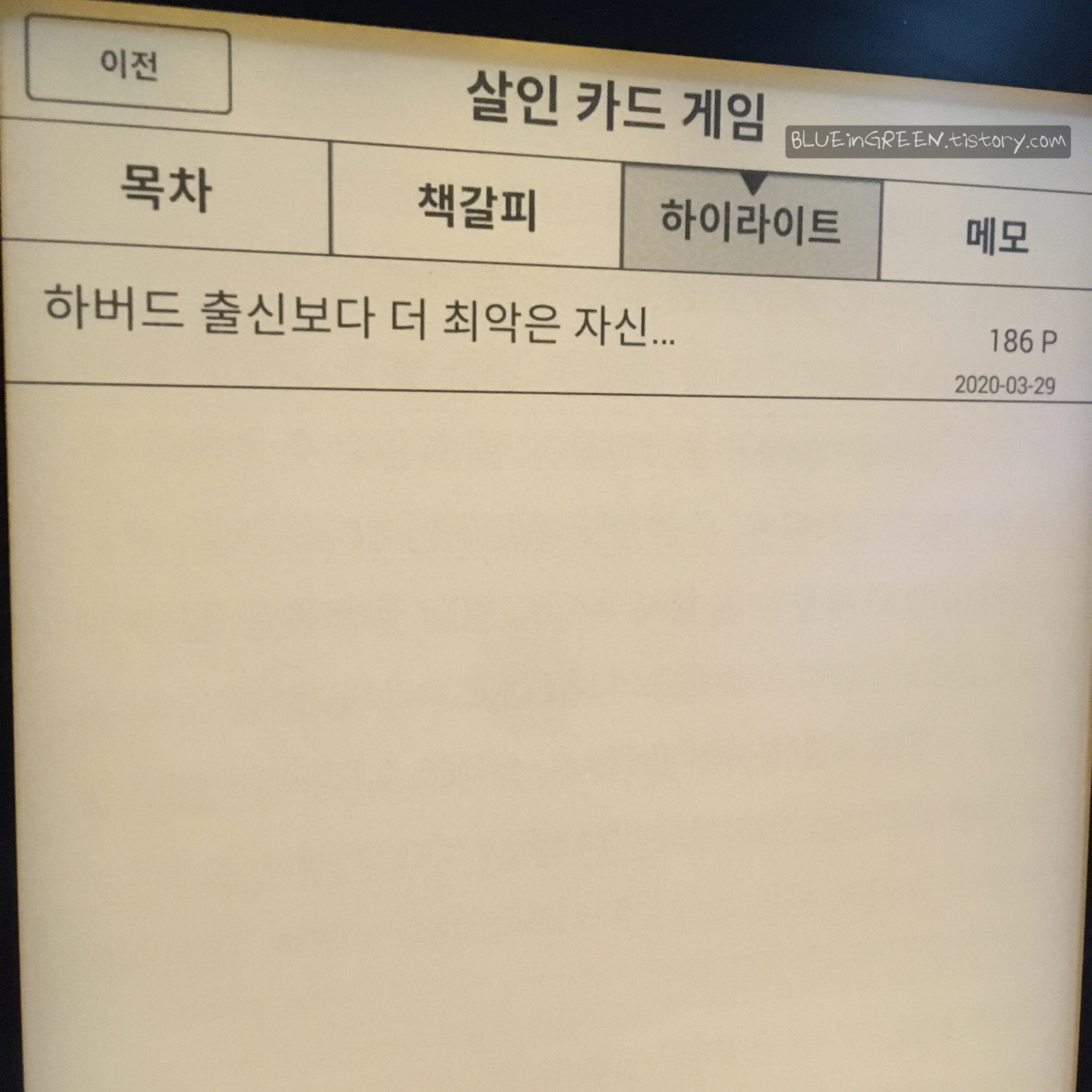 종이책을 읽을 때는 인상 깊은 구절을 필사해놓(으려고 노력하)는데, 전자책을 읽을 때는 하이라이트나 메모 기능을 사용해서 저장해 두었다가 나중에 한꺼번에 필사(으려고 노력)하면 된다는 것을 깨닫고 적극적으로 이 기능들을 활용하고 있다. '살인 카드 게임'을 읽을 때는 아래와 같은 방법으로 하이라이트와 메모를 활용했다.
