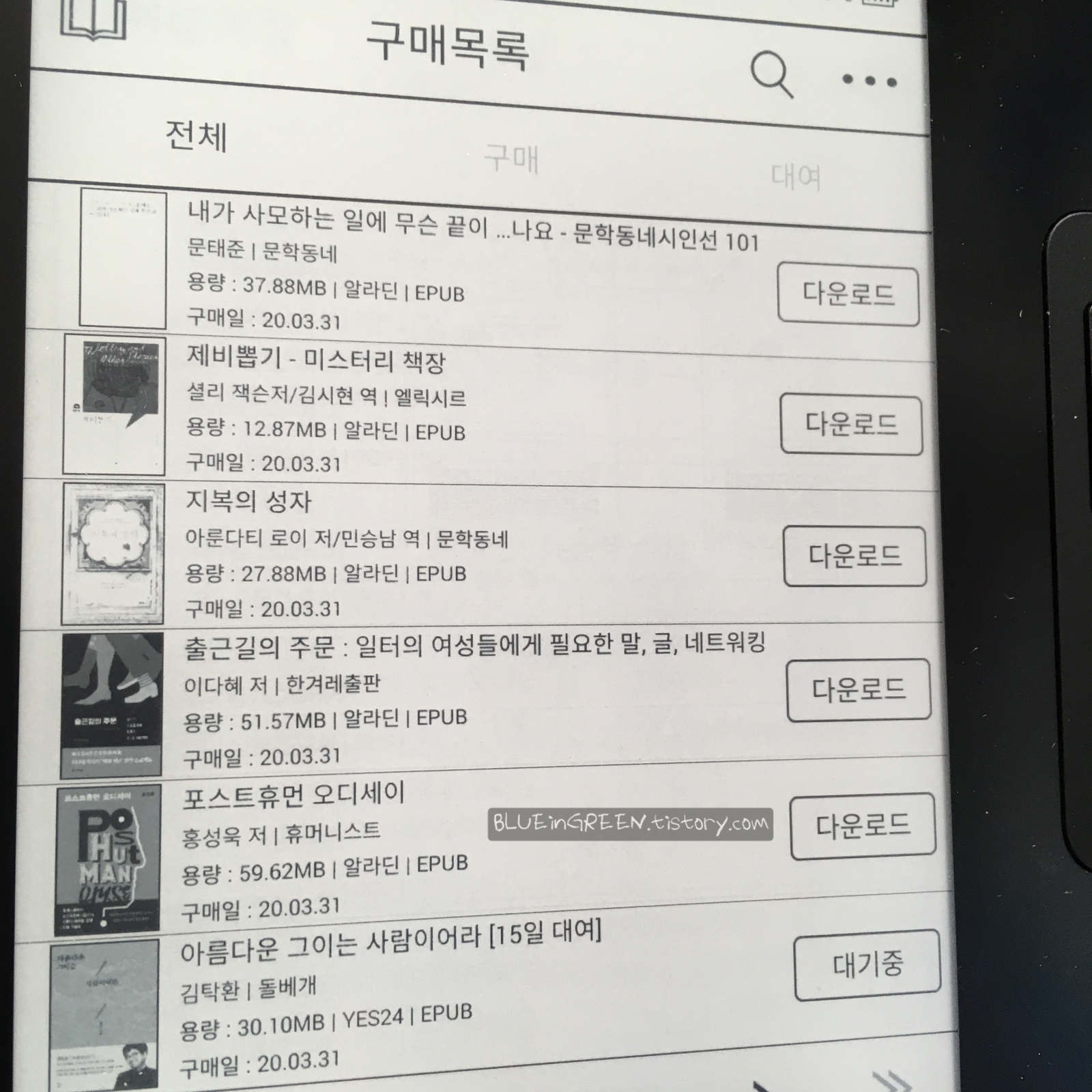 구매 목록을 업데이트하였더니 어제 산 전자책들과 어제 대여한 전자책들이 좌라락 올라옴ㅋㅋㅋㅋㅋ 한 달 동안 구입한 전자책은 아홉 권이다. 직장일 때문에(-_-) 고전문학책들을 먼저 좀 샀는데 전부 다 다른 출판사로 사봤다. 더클래식의 고골 단편집, 민음사의 개구리, 을유문화사의 제인에어, 문학동네의 페스트. 저걸 살 때는 2월 말 그러니까 진짜로 전자책을 사자마자였었어서 페스트가 이렇게 갑자기 베스트셀러로 등극할 줄 상상도 못했음ㄷㄷㄷ 세상 참 모를 일이다. 특히 올해는 진짜로 모를 일임.