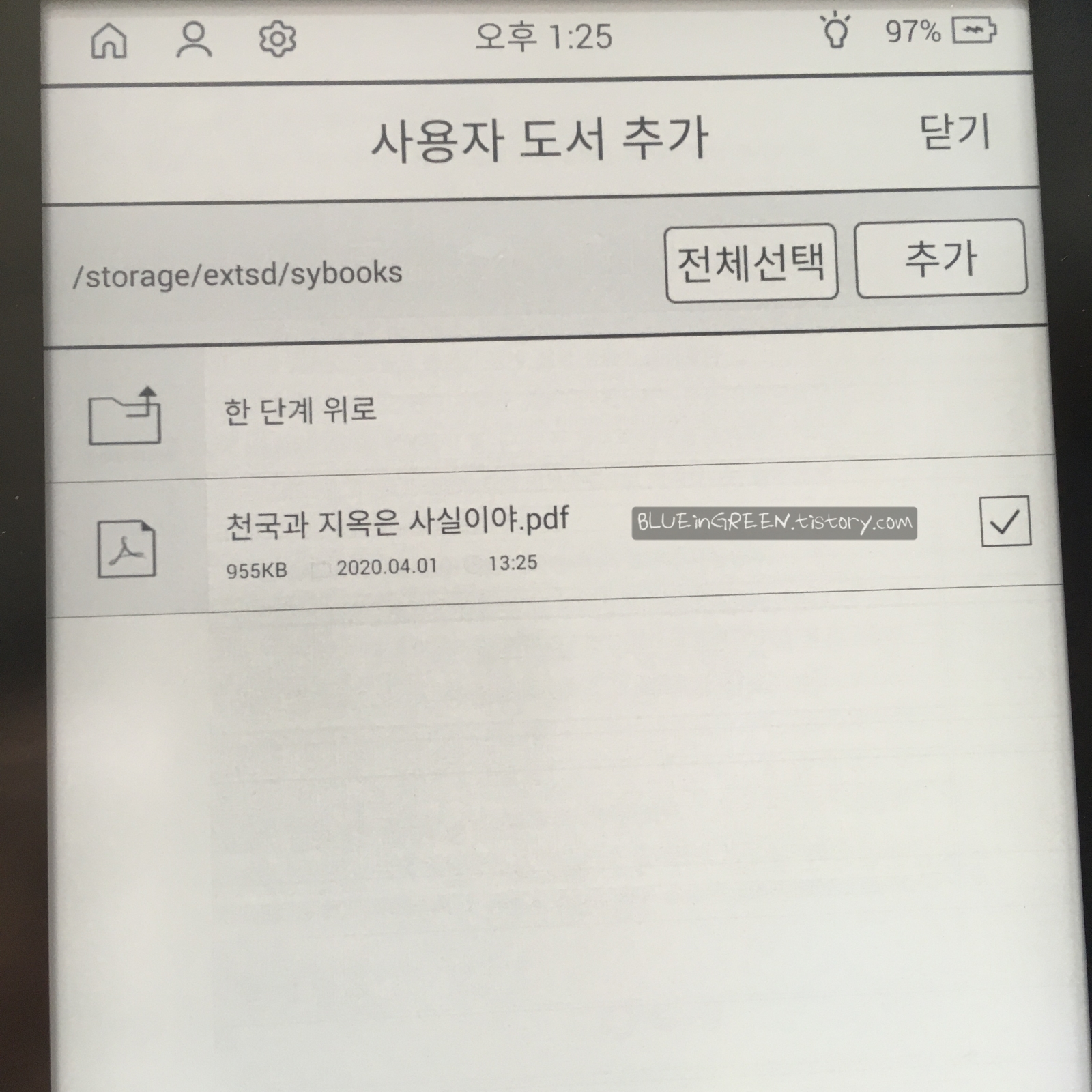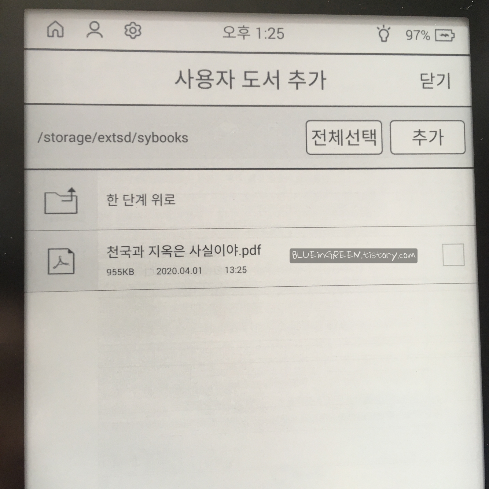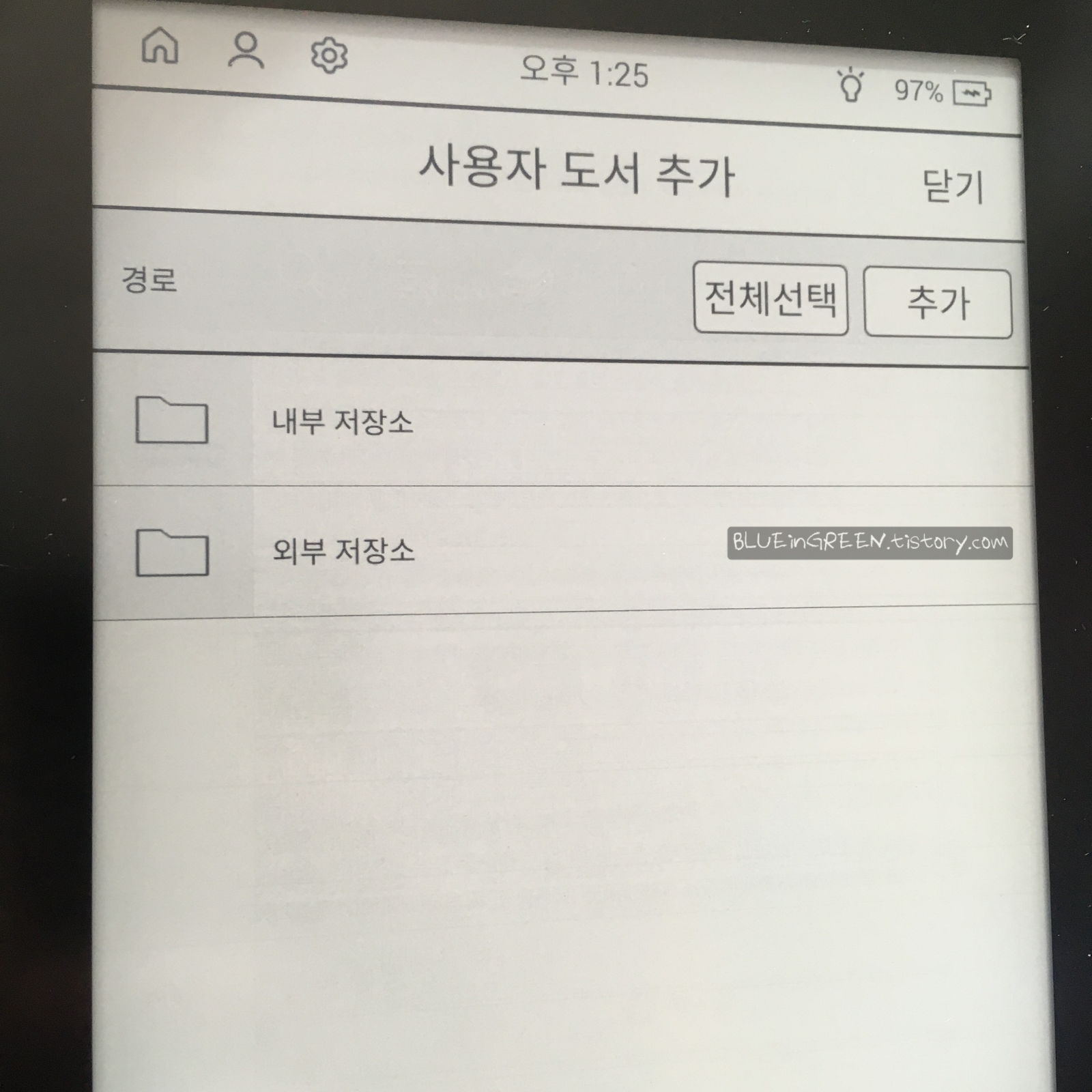 PDF 파일로 다운받은 소설을 좀 읽어볼 생각으로 크레타G가 연결된 상태에서 외부저장소에 새 폴더를 만들었다. 그리고 소설 파일을 넣은 후 크레타G의 통합뷰어 앱을 다시 클릭. 책장이 화면에 나왔을 때 'SD' 아이콘을 클릭하면 '사용자 도서 추가'라는 화면이 뜬다. 그때 '외부 저장소'를 선택해서 내가 만든 새 폴더를 클릭했다.