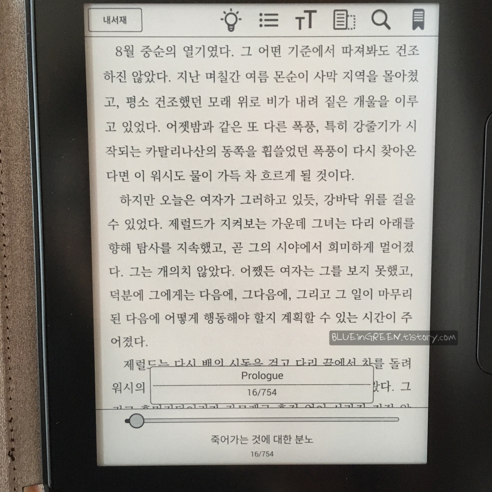 '죽어가는 것에 대한 분노'를 읽을 때 기본 폰트가 고딕 비슷한 것이었는데, 소설과 안 어울리는 느낌이라서 다른 폰트로 읽었다. 마음에 드는 폰트로 책을 볼 수 있다는 것 역시 전자책의 좋은 점.