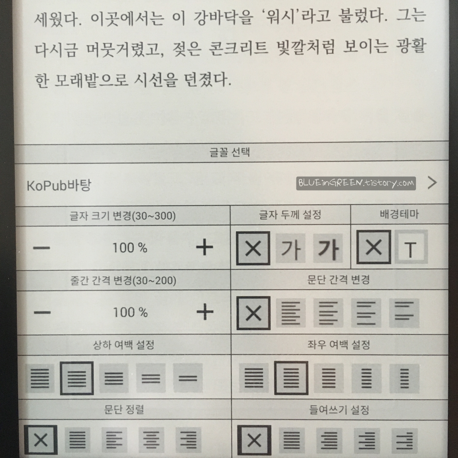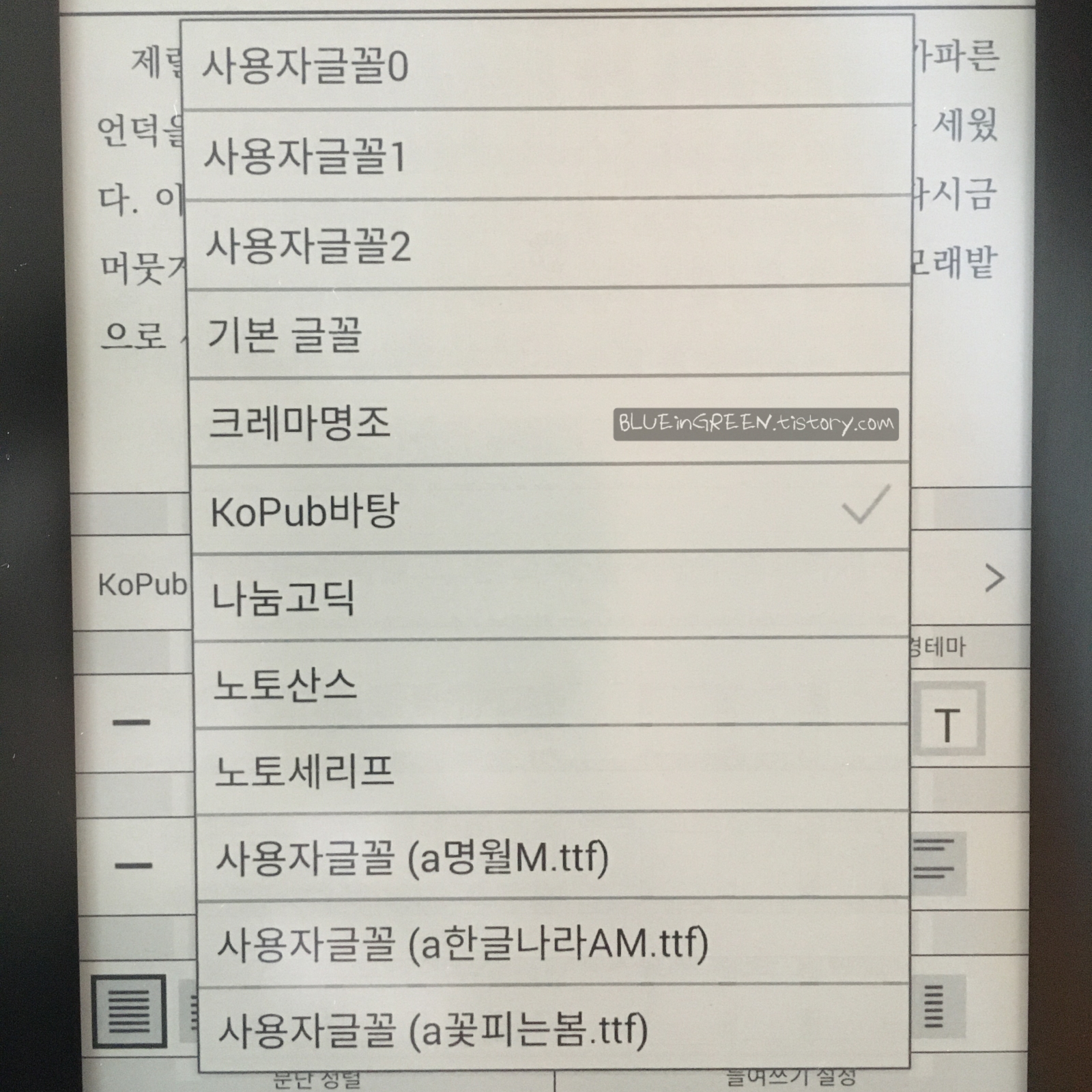 처음에는 KoPub바탕체로 설정했다가 다른 것들도 이것저것 해봤다. 카르타G에서 폰트를 바꾸려면 액정화면 상단이나 하단을 터치한 후 상단의 'T'자 모양 아이콘을 클릭하면 된다. 그러면 글꼴 선택과 관련된 화면이 뜨는데, 여기에서 글꼴을 선택함. 글자 크기나 상하 여백, 좌우 여백, 글자 두께 등도 설정할 수 있다.