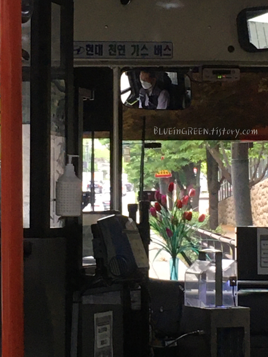 출근길에는 경기버스를 퇴근길에는 마을버스를 타고 다니는데, 어느날 아침 경기버스 9%번을 탔다가 기사님이 유리창 앞쪽에 꽂아놓으신 꽃이 너무 인상적이어서 사진을 안 찍을 수가 없었다. 저쪽에 인형을 넣어두시는 기사님도 계신데 요즘 못 뵀음. 그만두셨나(갑자기 슬픈 얘기네). 버스 안에서 기사님의 인간미가 느껴지는 순간을 만나면 괜히 마음이 따숩고 그릏다.