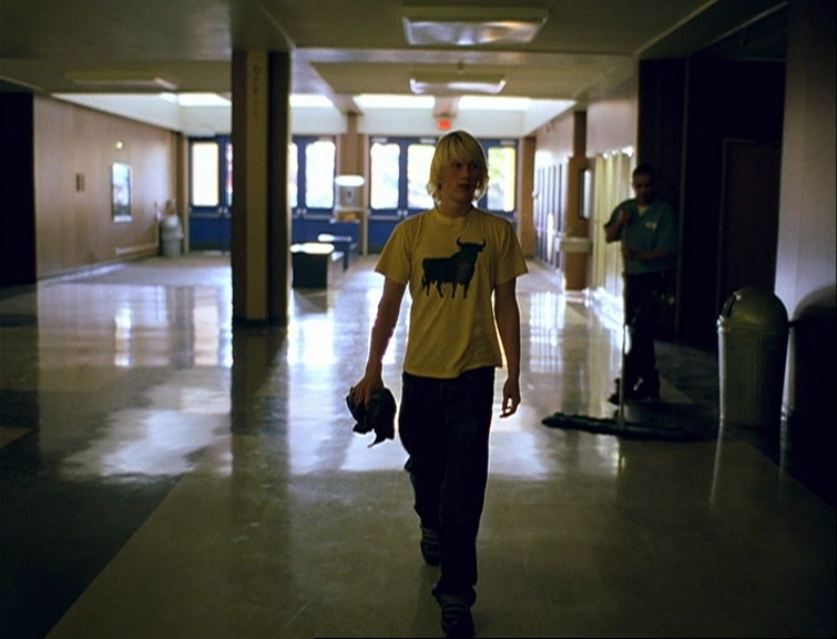 모두 다 틀린 생각이었다🙄 영화는 그날 아침 아버지와 함께 학교에 온 John의 시선을 따라가다가 교장선생님을 잠깐 보여주기도 하고, 사진을 좋아하는 Elias를 보여주고, Elias가 John의 사진을 찍는 장면을 보여주고, 반바지를 입지 않으면 점수를 깎겠다는 소리를 듣는 Michelle을 보여주고, Elias가 John의 사진을 찍을 때 Michelle이 그들을 지나쳐 도서관으로 들어가는 것을 보여주고, Carrie를 찾으려고 건물 안에 들어오는 Nathan을 보여주고, Nathan을 보며 이야기를 하고 자신들의 엄마 이야기를 하고 함께 학생 식당에서 밥을 먹는 Brittany, Nicole, Jordan을 보여주고, 동성애에 대한 이야기를 나누는 자리에 가는 Acadia를 보여주기도 한다. 각각의 사람들이 그날도 다른 날과 같이 자신의 일상을 평범하게 보내고 있었으며 어떤 위험도 느끼지 못하고 있었음을 알 수 있게 해 준다. John이 총으로 무장한 두 아이를 만나기 전까지.
