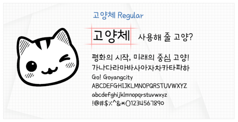 한때 고양시 폰트 진짜 많이 썼짘ㅋㅋㅋㅋㅋㅋ 고양일산체랑 고양덕양체도 좋지만 일반 고양체를 제일 즐겨 썼다. 예쁘고 딩벳 문자도 되고. 최성시장이 고양시장 할 때 이 고양이 캐릭터와 고양시 폰트가 다 만들어진 걸로 기억하고 있어서 나에게는 최성시장 이미지가 매우 좋닼ㅋㅋㅋㅋㅋㅋ 나에게 실질적인 도움을 준 시장이야!! 라는 느낌이랄까.