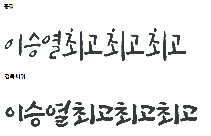 예쁜 꽃길체를 그냥 지나칠 수 없단 말입니다하하하하하. 상상토끼 폰트 페이지에는 회원가입을 해야 한다. 이 페이지에서 미리 폰트를 써 볼 수도 있는데, 무료 폰트 말고 유료 폰트들도 써볼 수 있다. 여러 폰트가 있지만 나는 꽃길체와 정묵바위체를 다운받을 생각이므로 이 두 개만 첨부해봄. 저 꽃길체처럼 손글씨 쓸 수 있으면 너무 좋을 것 같다ㅠㅠ