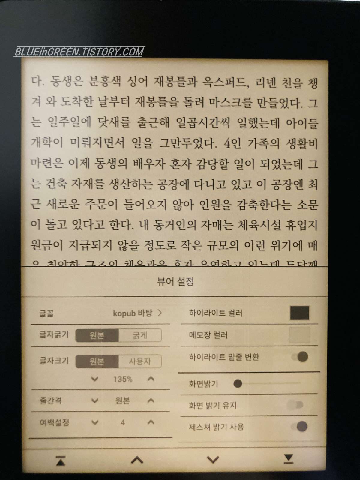 예전에는 글자 굵기도 바꿔보고('굵게'로 설정해놓고 읽었음) 줄간격도 바꿔보고(이것저것 다해봄) 하이라이트 컬러도 바꿔보고(그러나 어차피 흑백이라 큰 의미 없음) 했었지만 이보다 내게 더 중요한 건 여백설정을 바꾸는 것. 여백에 따라 책의 전체 페이지수를 늘릴 수도 있고 줄일 수도 있는 게 전자책의 장점이라고 나는 생각한다. 내용이 많은 책은 한 페이지에 들어가는 내용을 좀 줄여서 천천히 읽을 수 있으니까. 그래서 '여백설정'을 클릭함.