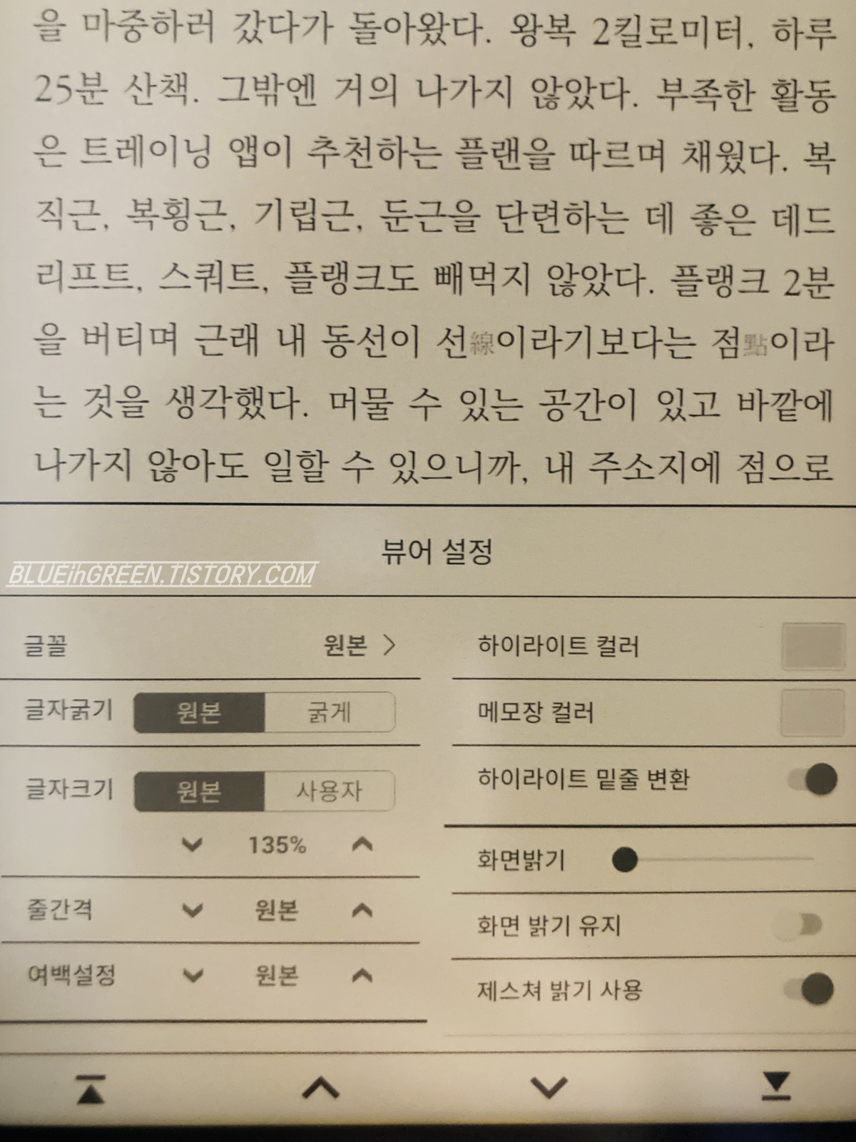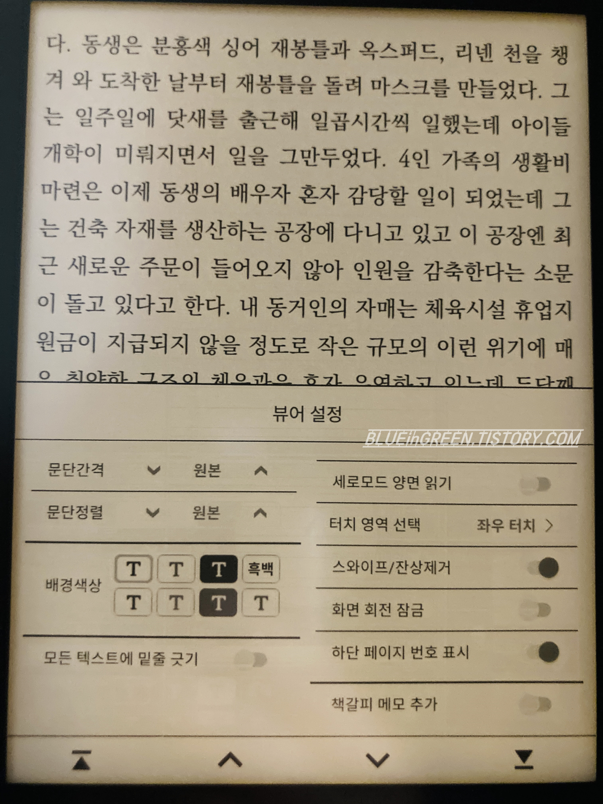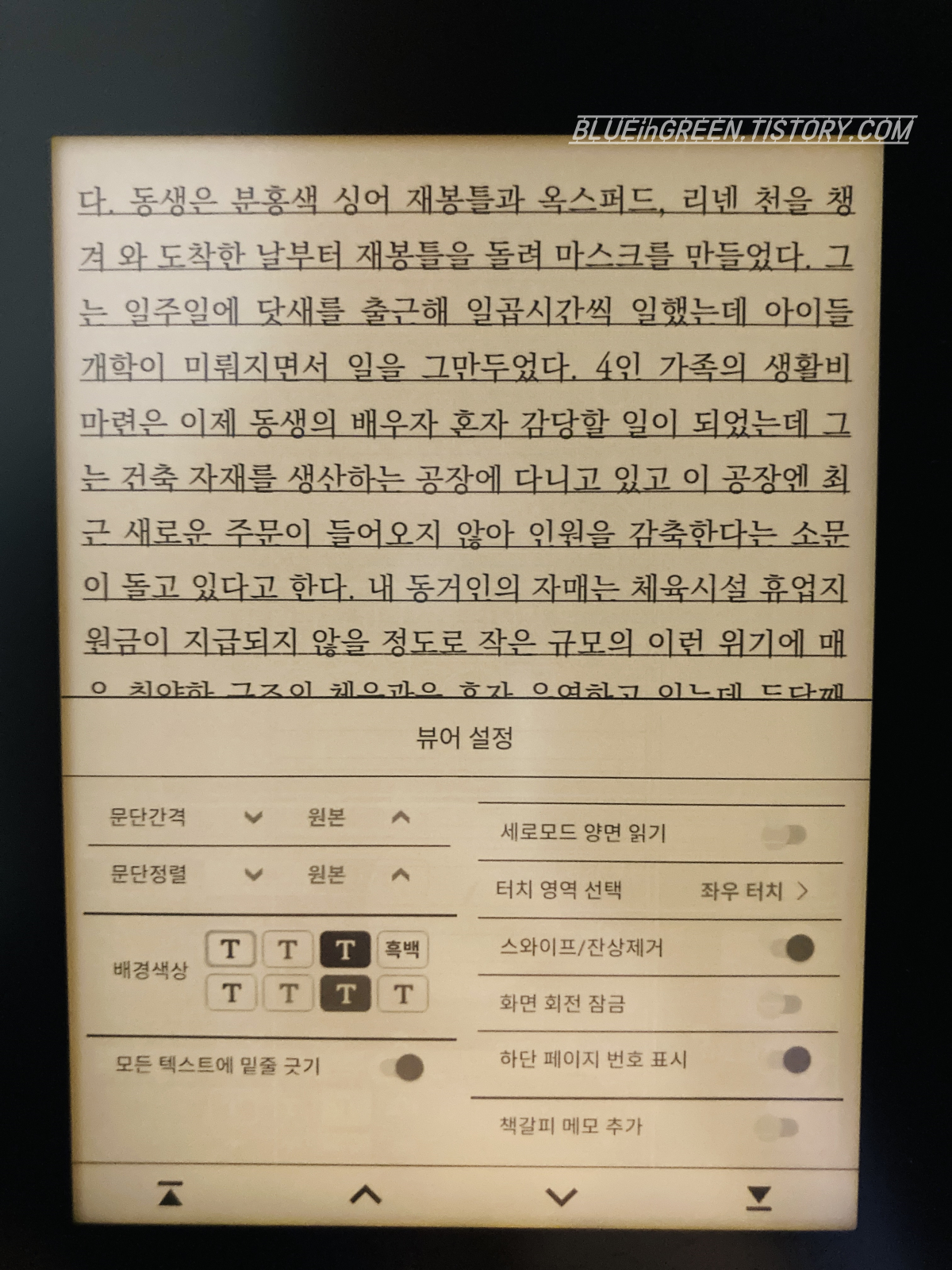 잔상 제거 설정도 하고 하단 페이지 번호 표시 설정도 해놓고 나니 갑자기 평소에 안하던 게 해보고 싶어져서 '모든 텍스트에 밑줄 긋기'를 해봤다. 그랬더니