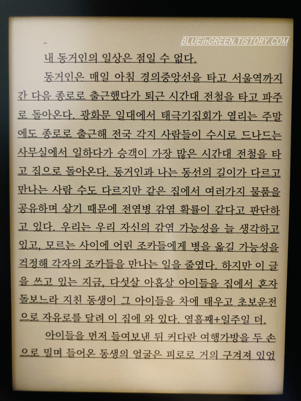 어 생각보다 나쁘지 않네? 하는 마음으로 밑줄을 그어놓은 채 읽다가 아무래도 낯설어서ㅋㅋㅋㅋ 결국은 다시 없앴다. 하이라이트 컬러도 너무 진하게 해놨더니 글자가 보이지 않아서(하이라이트가 진해도 글자는 흑색으로 출력되기 때문에 너무 진하지 않은 게 낫다) 원래 쓰던 '연한 회색'으로 다시 설정. 대체 왜 외부저장소의 책들이 다 지워졌는가는 여전히 의문이지만🤔🤔 내가 알 수 없는 이유가 있었겠지. 기계란 알 수 있는 것 같으면서도 알 수 없는 것이니까🤔🤔🤔🤔 그래도 초기화했더니 전보다 조금, 아주 조금, 아주아주아주 조금 덜 버벅대는 것 같기도 해서 결과적으로는 나쁘지 않은 거 같고…