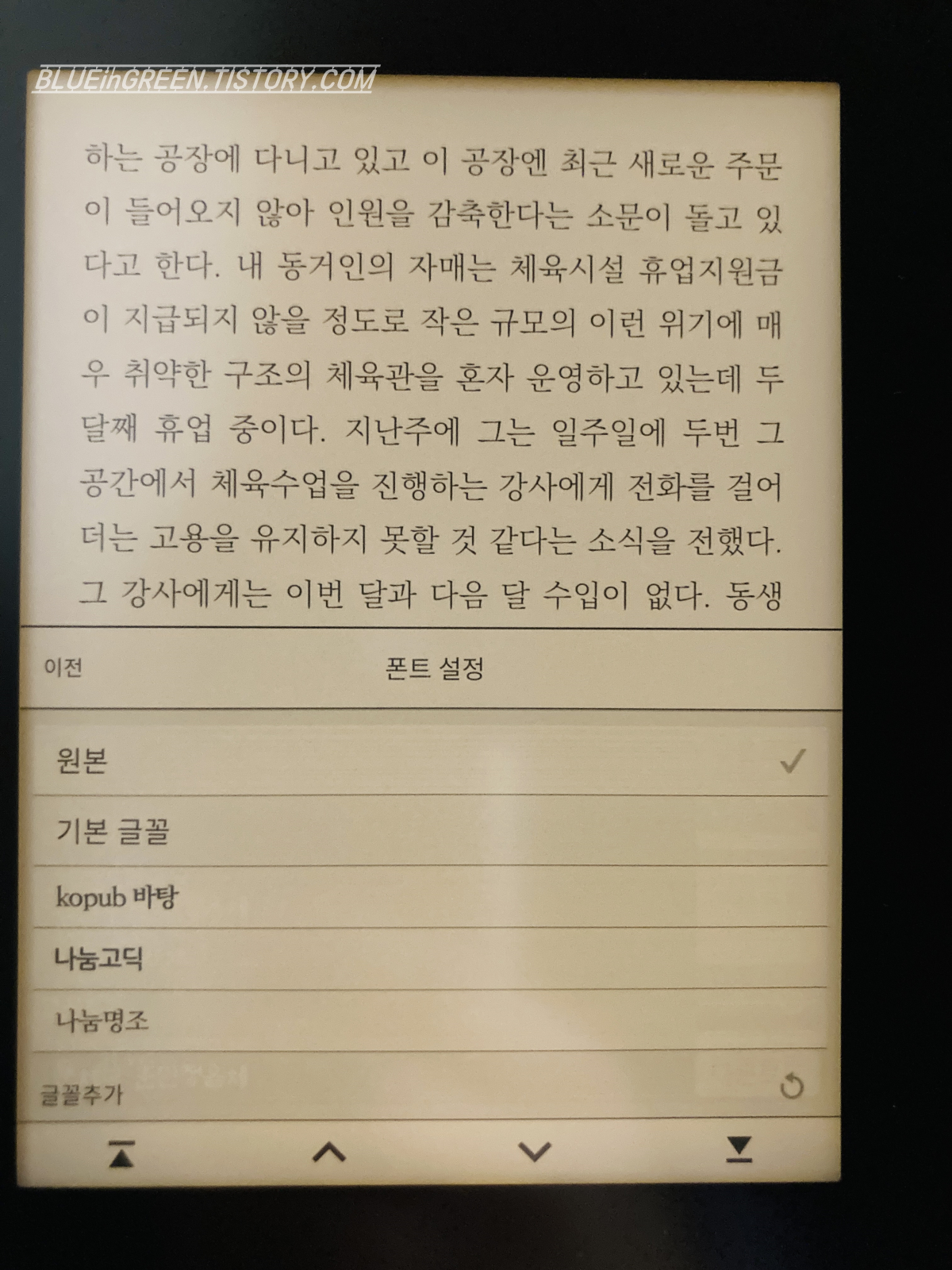 위의 설정 이모티콘을 클릭해서(누구나 다 아는 저 톱니바퀴 모양) '뷰어 설정' 창으로 들어간 다음, '글꼴'에서 원하는 폰트를 선택하면 된다. 나는 카르타G에서 기본제공해주는 kopub 바탕체를 선호하기 때문에 kopub 바탕체로 설정했다. 추가 폰트도 설치하지 않았다. 예전엔 이것저것 설치해서 써보기도 했는데 결국은 다시 kopub 바탕체로 돌아오게 되더라 이상하게.