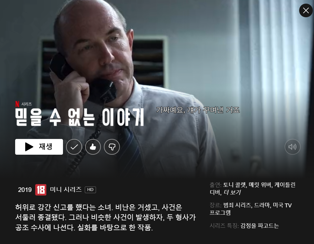 넷플릭스 사이트의 믿을 수 없는 이야기 1회 요약 멘트는 이렇다: 자신의 집에서 강간을 당했다는 소녀, 마리. 그녀는 계속되는 질문과 끔찍한 기억에 점점 혼란스러워진다. 엇갈리는 진술에 형사들의 의심은 커지고, 상황은 악화된다. 저 구절만 보면 '강간을 당했다'는 것이 가장 중요한 것 같지만, '계속되는 질문'과 '혼란'과 '의심' 역시 그만큼 중요하다. 스스로도 믿을 수 없고 믿고 싶지 않은 일이 실제로 일어났는데, 그 일이 실재했다는 걸 아무도 믿어주지 않아, 결국 나마저도 그 일을 부인하게 되는 과정이 1회에서 그려지니까.